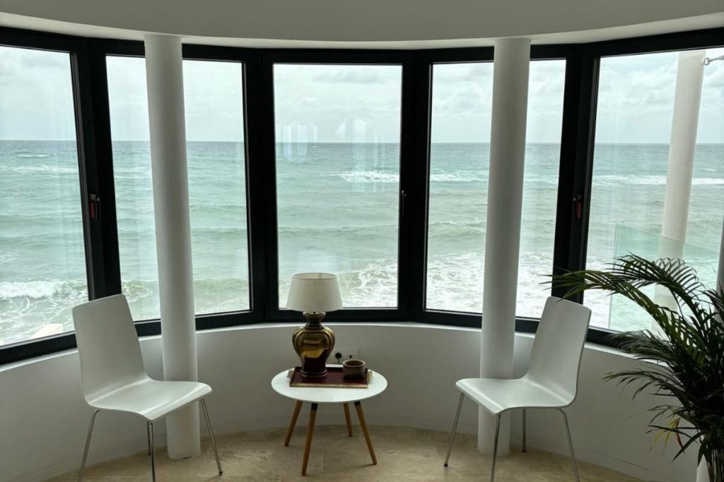 El diseño curvo está pensado para maximizar el ángulo de visión. Al adaptar la perfilería de aluminio a la forma natural de la fachada, logramos una panorámica limpia del exterior, permitiendo que el mar o el paisaje se conviertan en los verdaderos protagonistas de la habitación.